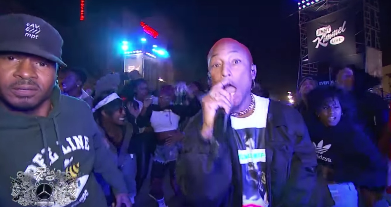 Four years ago, Jimmy Kimmel showed up in Pharrell's video for the globe-conquering monster hit "Happy." And maybe that's why Pharrell's reunited N.E.R.D. project chose Kimmel's show for what was only their second live performance since 2011. Pharrell was a guest on Kimmel last night, where he talked about how he won't play "Happy" for his kids and where Kimmel made fun of N.E.R.D.'s rider. And then N.E.R.D. performed, doing two tracks from their just-released new album No_One Ever Really Dies, the Rihanna collab "Lemon" and the Future collab "1000." Rihanna and Future weren't there, but N.E.R.D. found a cool way to perform the songs anyway, doing them in the middle of the crowd at Kimmel's outdoor festival-stage set. They were surrounded by dancers, and Mette Towley, the striking dancer from their videos, made a big entrance. Check out the performances and the interview below.