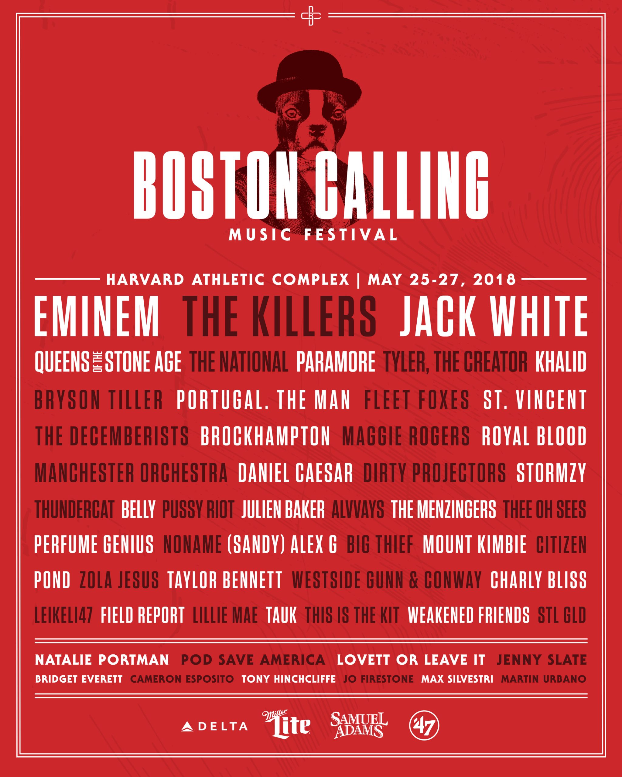 Another day, another festival lineup with Eminem at the top. Following Coachella and Governors Ball, Boston Calling is the latest contender to reveal its 2018 lineup, and like both of those festivals, it features Eminem as one of its main headliners. The other two are the Killers and Jack White, and the rest of the bill is rounded out by artists including Queens Of The Stone Age, the National, Dirty Projectors, Paramore, St. Vincent, Fleet Foxes, Thundercat, the Decemberists, Tyler The Creator, Perfume Genius, Charly Bliss, Thee Oh Sees, Khalid, Brockhampton, Maggie Rogers, Belly, Julien Baker, the Menzingers, (Sandy) Alex G, Big Thief, Mount Kimbie, and Noname. Curated by the National's Aaron Dessner along with a series of special programming curated and hosted by Natalie Portman, the fest takes place over Memorial Day Weekend, 5/25-27, at the Harvard Athletic Complex in Allston. Find ticket information here and check out the full music and comedy/entertainment lineups below.
