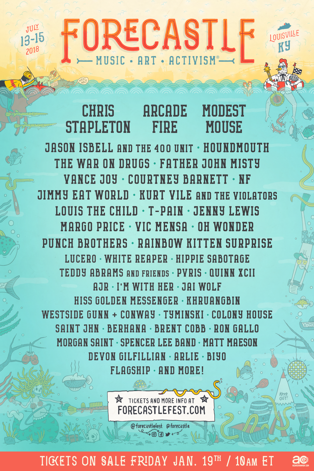 Finally, a 2018 festival that Eminem isn't headlining! Instead, Forecastle will have Chris Stapleton, Arcade Fire, and Modest Mouse, along with an undercard that includes Jason Isbell & The 400 Unit, the War On Drugs, Father John Misty, Courtney Barnett, Kurt Vile, T-Pain, Jenny Lewis, Margo Price, Vic Mensa, White Reaper, Hiss Golden Messenger, and Westside Gunn + Conway. The festival will take place 7/13-15 at Louisville, Kentucky's Waterfront Park, and you can check out the full lineup in text form below.