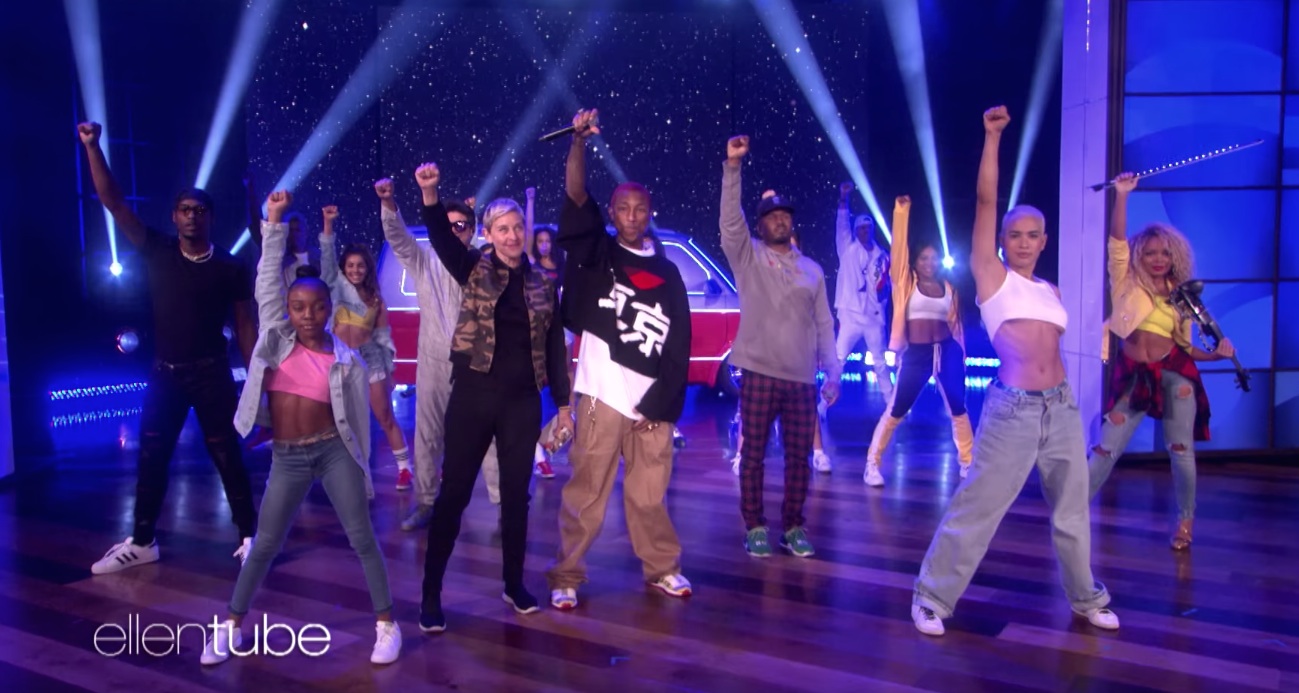 It would seem that the Neptunes' revived group N.E.R.D. have devoted much of the album cycle behind their new LP No_One Ever Really Dies to making a star out of the dancer Mette Towley. And it's working! Today on Ellen, N.E.R.D. performed. They did the Rihanna collab "Lemon," and while Rihanna wasn't there, Towley was. Also there: A whole crew of street dancers (and some tapdancers, and a violinist), all of whom got moments to perform while people next to them held placards with their Twitter handles. It makes for a hell of a fun performance. (Also appreciated: Chad Hugo doing absolutely nothing other than an extremely lackadaisical running man.) On the show, Ellen DeGeneres also interviewed Pharrell, introducing him to the 11-year-old fitness trainer Demarjay Smith. Watch the interview and the performance below, via Miss Info.