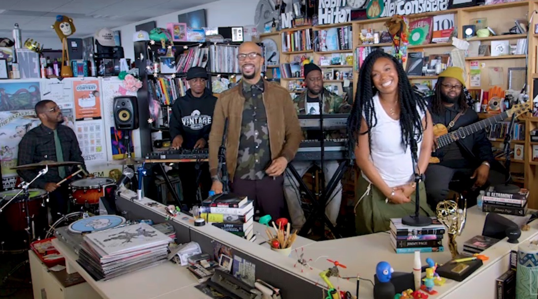 At the beginning of the new Tiny Desk, Common also explained that they wanted to foreground women with their performance, even though all three members of the group are male. So they played a longer Tiny Desk than the series usually allows, playing five songs rather than three and including collaborations with singers Brandy, Andra Day, and Maimouna Youssef.