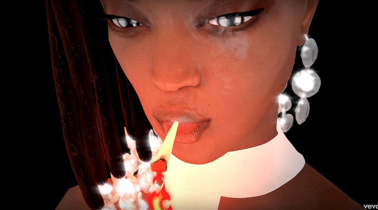 The "Frontline" video, which tells the story of a breakup, is an R&B video, and it indulges a lot of the cliches of R&B videos. It's got a narrative of romantic upheaval, told theatrically, with tears and dramatic gestures. It's got a fancy car. It's got a synchronized dance scene. But the twist, of course, is that the whole video is computer-animated to look like a mid-'90s video game, with Kelela and her co-stars existing only as uncanny-valley polygonal creations. There's some elegant surrealism in there, too.