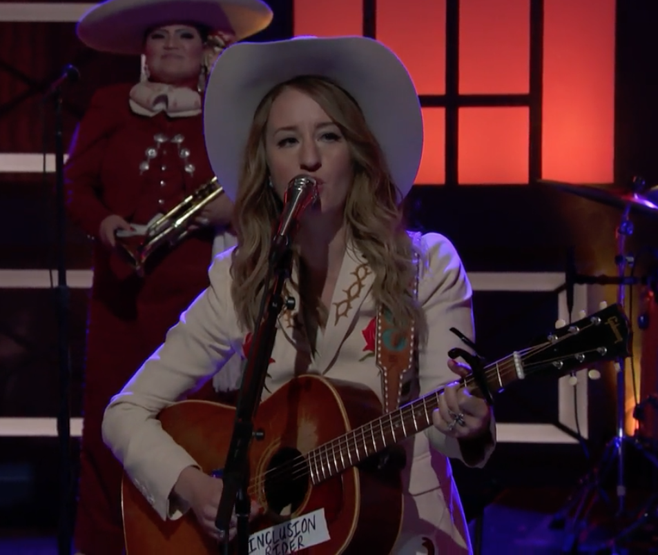 Decked out in cowboy hat and Nudie suit, Price played "Pay Gap," her mariachi-infused lament from last year's All American Made. The song takes women's struggle for equal wages and fair treatment head-on, with unflinching lyrics including "It's been that way, with no equal pay/ And I want to know when it will be fixed/ Women do work and get treated like slaves since 1776" and "We're all the same in the eyes of God, but in the eyes of some rich white men/ No more than a maid to be owned like a dog/ A second-class citizen."
