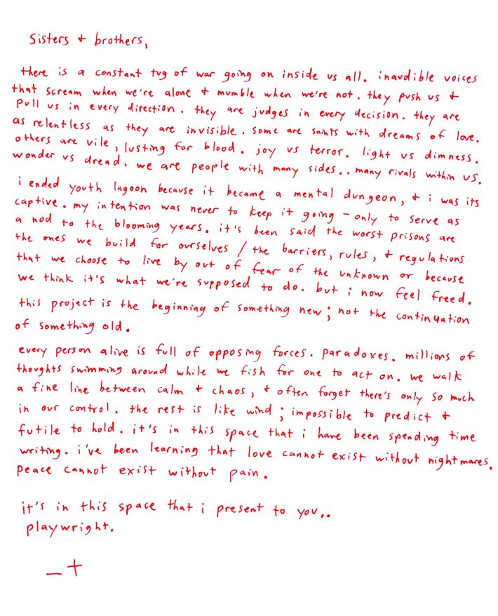 An irregular music box introduces "Playwright," twinkling and winding in fragments as Powers' vocals build to a delicate gurgle. He sings of a bright future, blooming out of a dark past. Powers shares this new material with a note explaining his retirement from Youth Lagoon. He writes about feeling trapped, referring to the former project as a "mental dungeon."