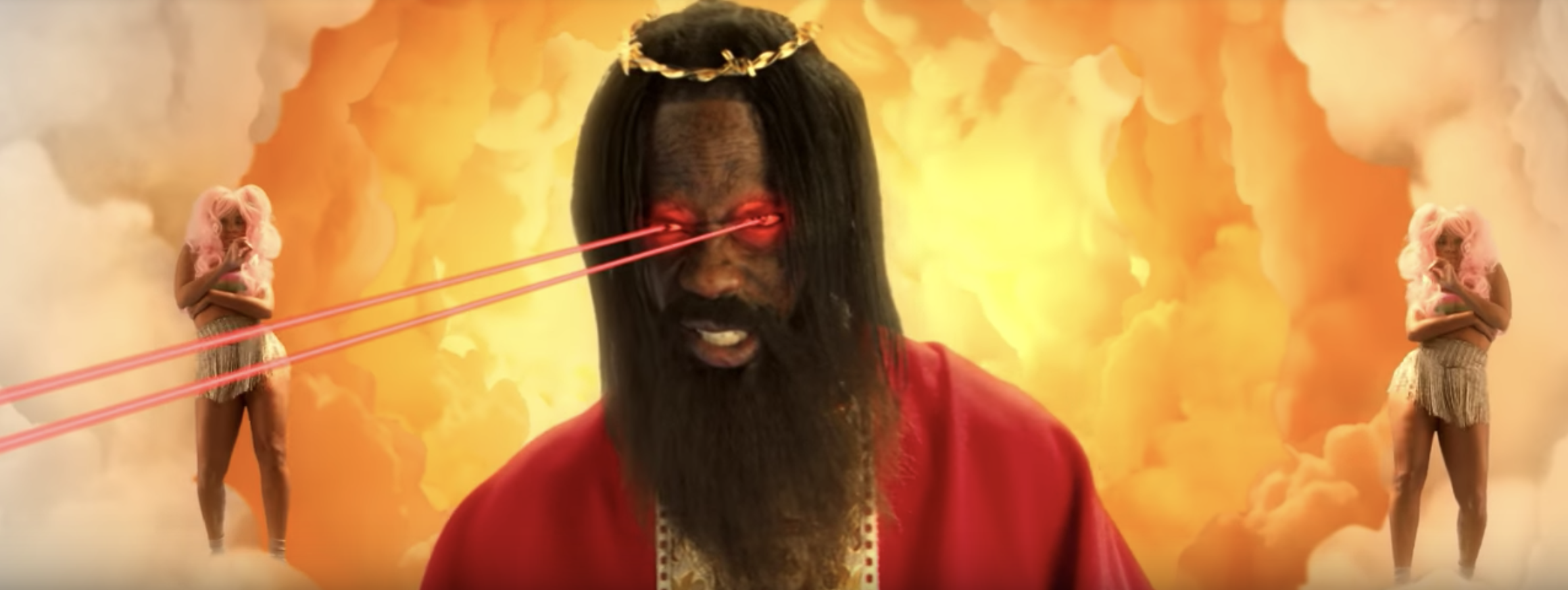 Scott obtains godliness after being engulfed in flames. Following that very casual incident, we find him among wreckage in gold-painted Kylie Jenner's arms. He rides a fire-breathing dragon and baptizes people. His eyes shoot lasers and his face melts off. Then comes what my colleague Tom Breihan called "the prettiest things [he has] heard in recent memory." James Blake's angelic falsetto soars with Stevie Wonder's harmonica as the camera pans to a luminous Jenner, now holding a baby goat. Watch below.