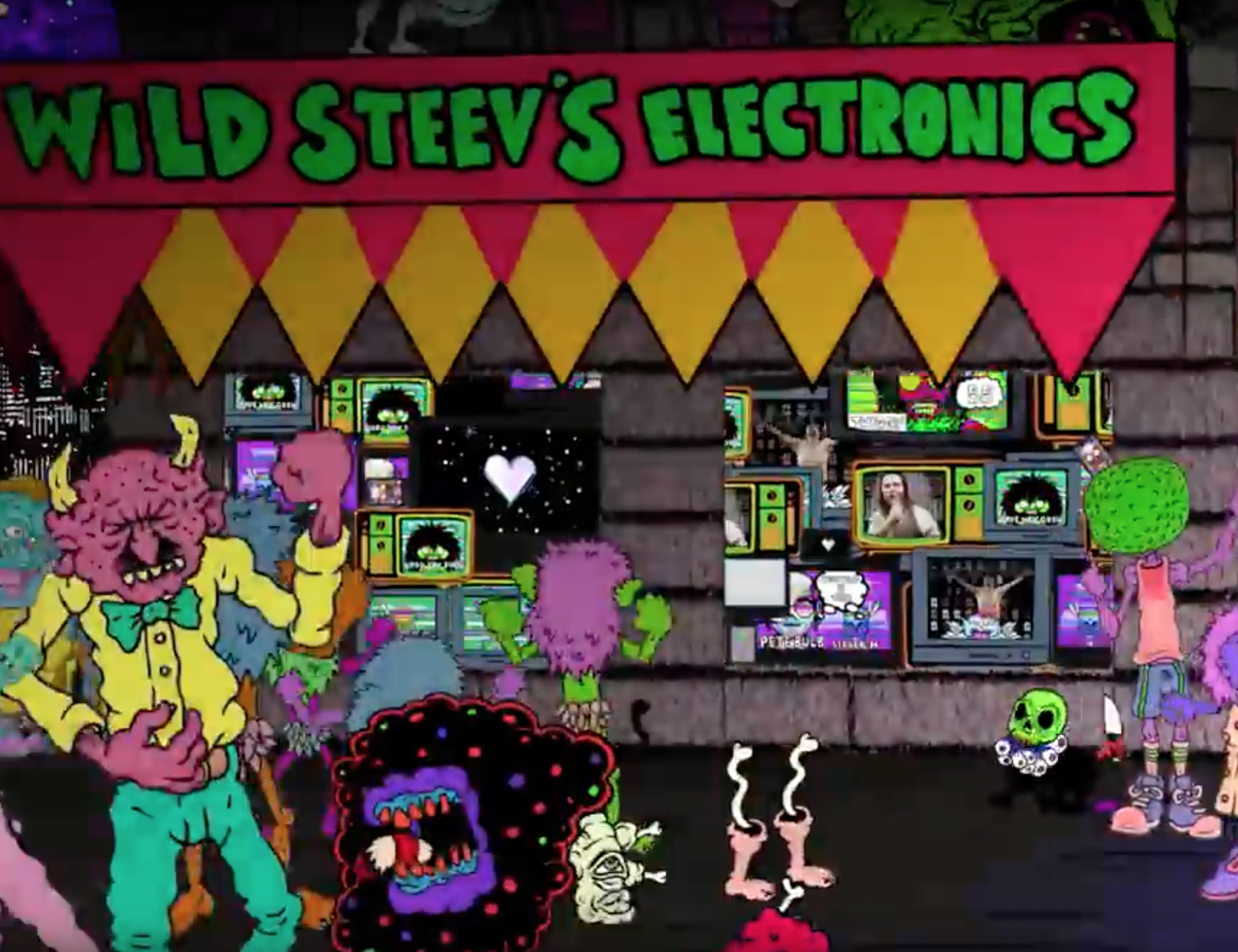 Right around the video's 1:35 mark, the green-screen scene displays the image of a store called "Wild Steev's Electronics." The "Steev" in question is obviously Steev Mike. That's a throwaway. Look more closely though.