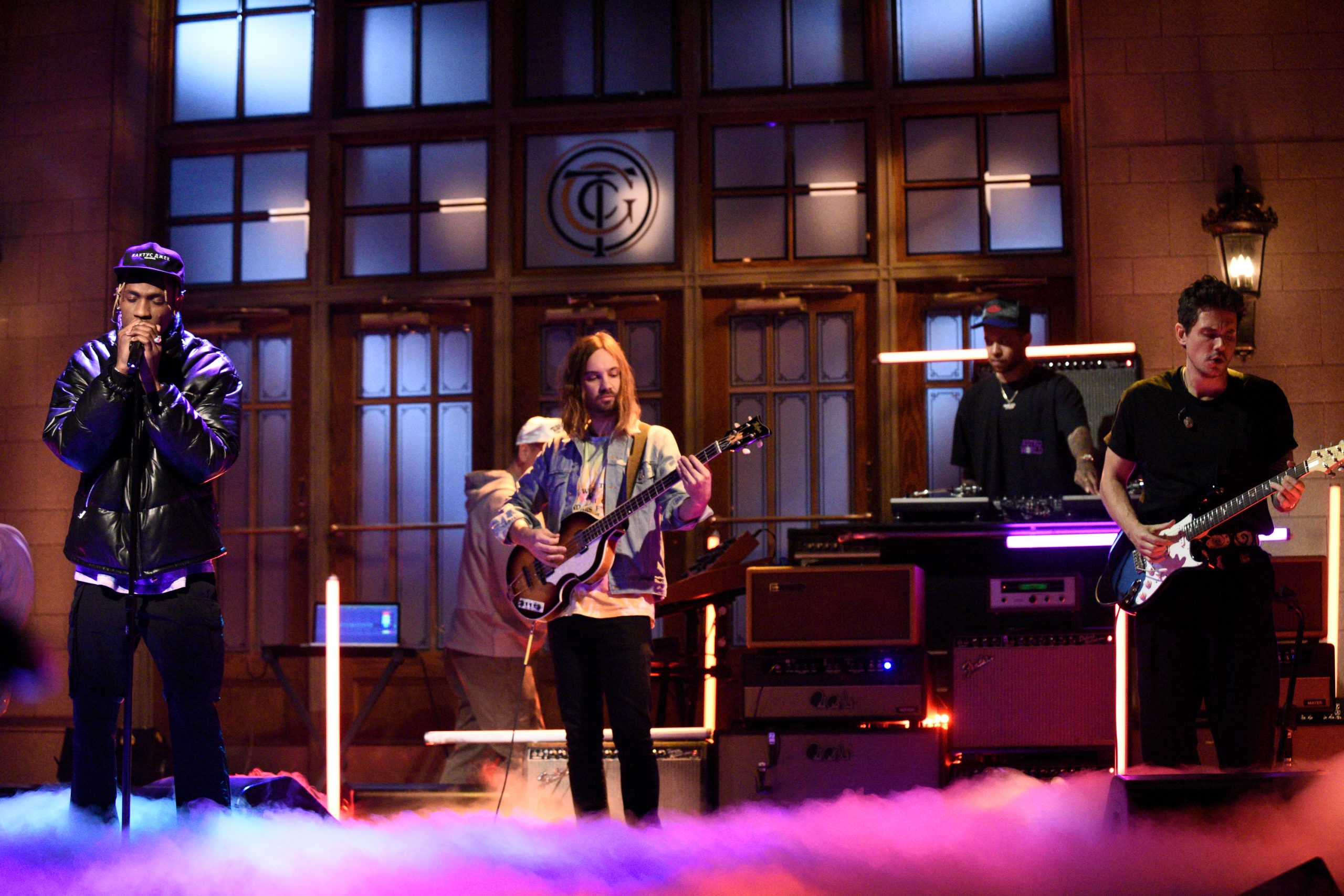 Travis Scott was the musical guest on last night's episode of Saturday Night Live. He performed three songs from his recent #1 album Astroworld: "Sicko Mode" and a medley of "Skeletons" and "Astrothunder." He was joined by Tame Impala's Kevin Parker, John Mayer, and Mike Dean for the medley. Parker co-produced and co-wrote "Skeletons."