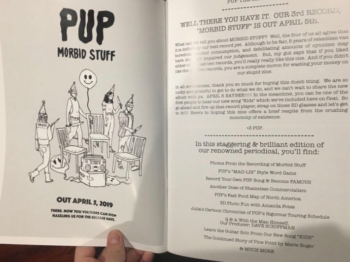 PUP announced the news in a zine and 3D comic book mailed to fans this week. The album is called Morbid Stuff, and it's set to be released on 4/5. And along with photos and games, the zine includes a flexi-disc of a new song called "Kids." Check out some photos below.