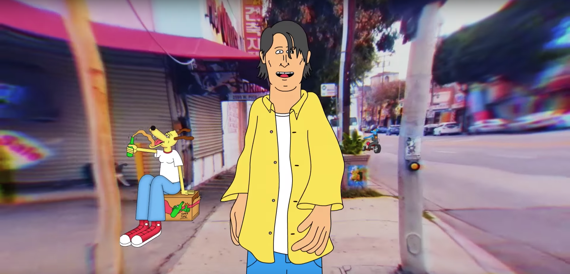 The slinky Robert Strange- and James Papper directed-video for “Rushing The Acid Frat” portrays a cartoon version of Malkmus, front-and-center, sauntering around an acid-view of Los Angeles locales. Among his stops, Malkmus drops into Koreatown and the Hollywood Forever Cemetery. A whole cast of anthropomorphic animals and objects make cameos as well.