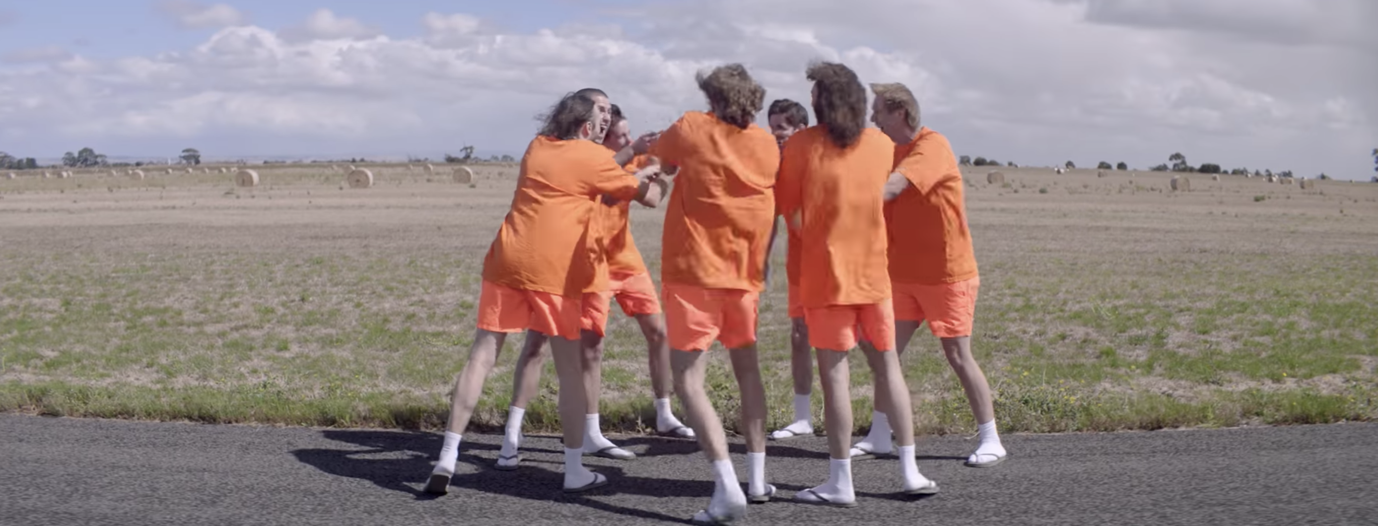 The video begins with the band on an empty rural highway, barking like dogs and wearing matching neon orange getups. They dance, run around, and laugh maniacally. A man drives in and shoots all of them before setting their bodies on fire.