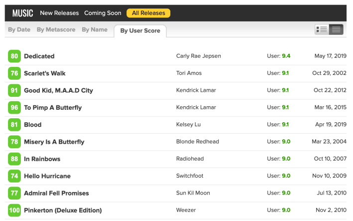 Dedicated now has the highest Metacritic user score of all time, putting it ahead of albums like Kendrick Lamar's To Pimp A Butterfly and Radiohead's In Rainbows, both of which are also in the top ten. It's also worth nothing that Switchfoot's Hello Hurricane is #8.