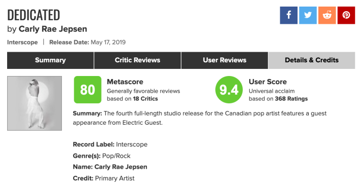 Carly Rae Jepsen released her new album, Dedicated, last week. As my colleague James Rettig put it in his review, Dedicated is "very much just a collection of pop songs," some of which are pretty good, but most of which are just fine. But the CRJ stans beg to differ.