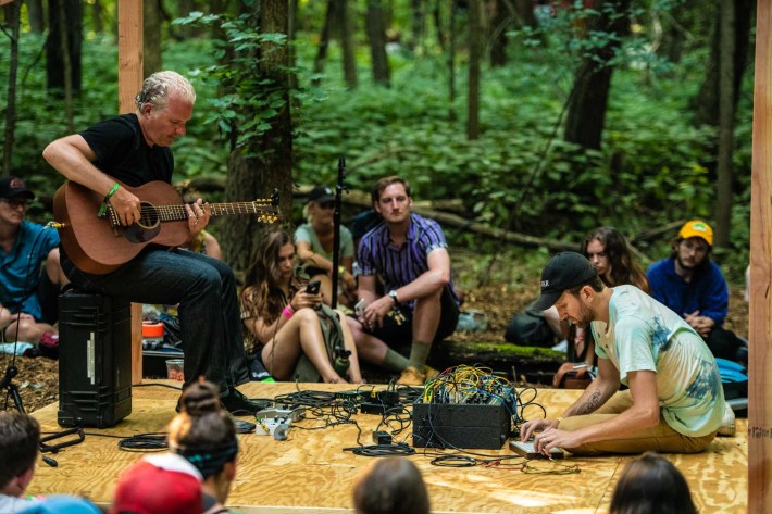 Recorded in an open-air room with the doors open to nature, the project incorporates rainfall and other ambient sounds. On "Sharon," a flickering pitch-shifted sample of Sharon Van Etten's voice underscores loosely timed plucky acoustic triads. That trilling creates a feeling of silence, or absence, that becomes like its own character in the environment they've created. Harmonically, the plucks, slides, and hammer-ons build upon each other. They're allowed to completely ring out on the strings, supplying an additional sense of expansive space. A warbling synth tone appears sprinkled throughout, almost bubbling to the surface of that at times overwhelming silence.