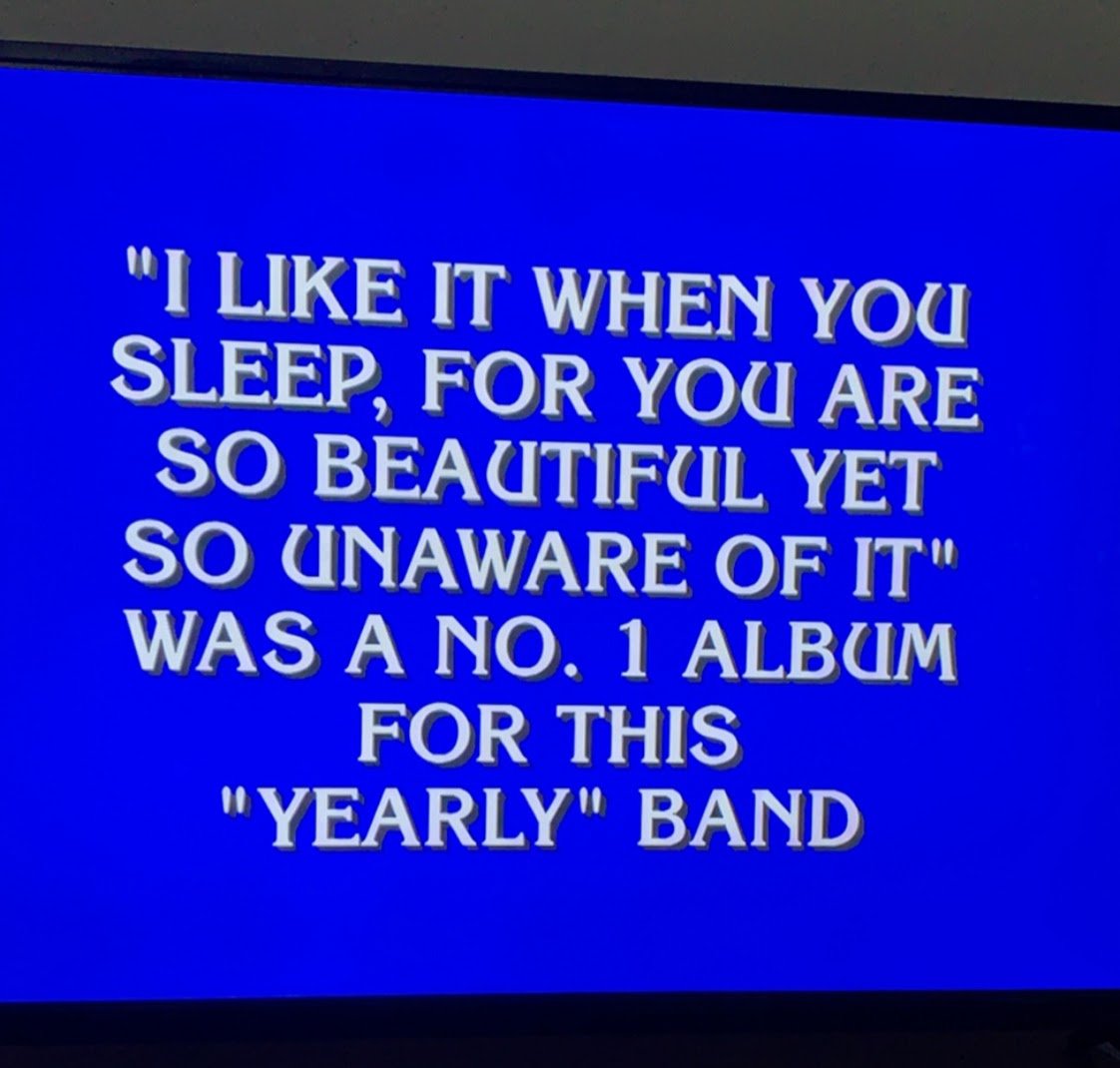 It turns out Jeopardy! contestants aren't always the biggest music fans. Last year, a contestant confused Uncle Kracker with Kid Cudi. They haven’t been able to get the Kendrick Lamar, Frank Ocean, or Radiohead clues. And it turns out they're not familiar with the 1975 either. "I Like It When You Sleep, For You Are So Beautiful Yet So Unaware Of It was a No. 1 album for this 'yearly' band," Alex Trebek poses to collective silence. "Who are the 1975." Watch below.