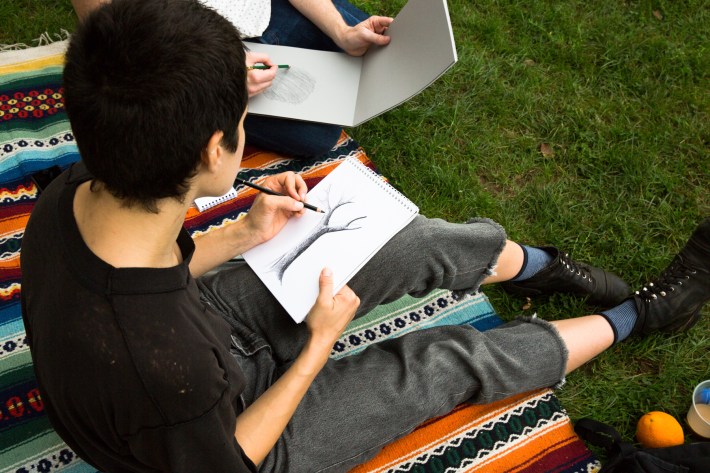 We're at Brooklyn’s Prospect Park on a Thursday afternoon to enjoy the last drops of summer and to draw together for a bit. She’s brought two sketchpads, colored pencils, and a multi-hued blanket for us to sit on. She shows me some of the drawings already in her sketchpad: a few rough drafts of concert posters that in my estimation are one coloring job away from being ready, and a delicately rendered portrait of her girlfriend, all while insisting that she wishes she was better at drawing. I find that a bit absurd, though I do relate.