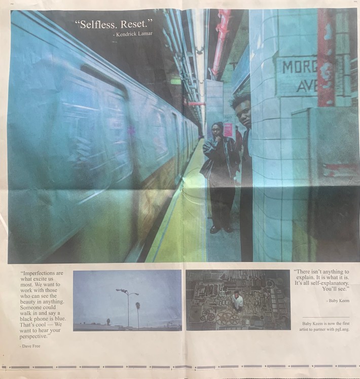 The pgLang site also features a "visual mission statement" for the company, a four-minute short film starring Kendrick, Keem, Jorja Smith, and Yara Shahidi. The clip opens with "Jump 2," an unreleased Keem song that, according to Genius, features Kendrick. It concludes with new music written by Florence Welch and Kamasi Washington. The company also announced itself with a wraparound ad that covered the Los Angeles Times today:
