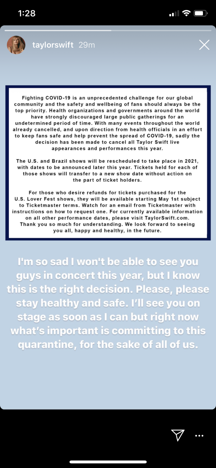 It looks like some of the people behind those big, thousands-strong gatherings are starting to grapple with this reality as well -- including Taylor Swift. In a different version of 2020, Swift would've been bringing her Lover Fest tour across the world. Now, in an Instagram story, she's announced that all of her 2020 live performances are cancelled. The US and Brazil legs will be rescheduled for 2021.