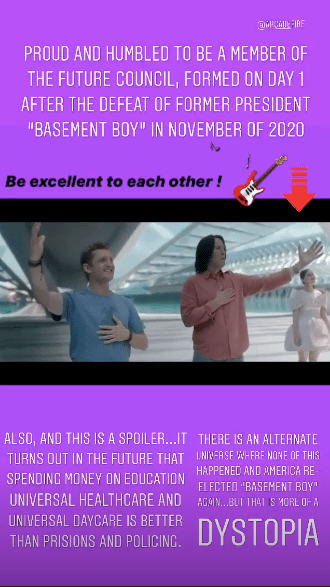 "Proud and humble to be a member of the future council, formed on day 1 after the defeat of former president 'Basement Boy' in November of 2020," Butler wrote on his Instagram story. "Also, and this is a spoiler ... it turns out in the future that spending money on education universal healthcare and universal daycare is better than prisons and policing. There is an alternate universe where none of this happened and America reelected 'Basement Boy' again ... but that is more of a dystopia."