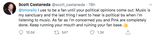 "I use to be a fan until your political opinions come out," Scott Castaneda wrote in a since-deleted tweet. "Music is my sanctuary and the last thing I want to hear is political bs when i’m listening to music. As far as i’m concerned you and Pink are completely done. Keep running your mouth and ruining your fan base."