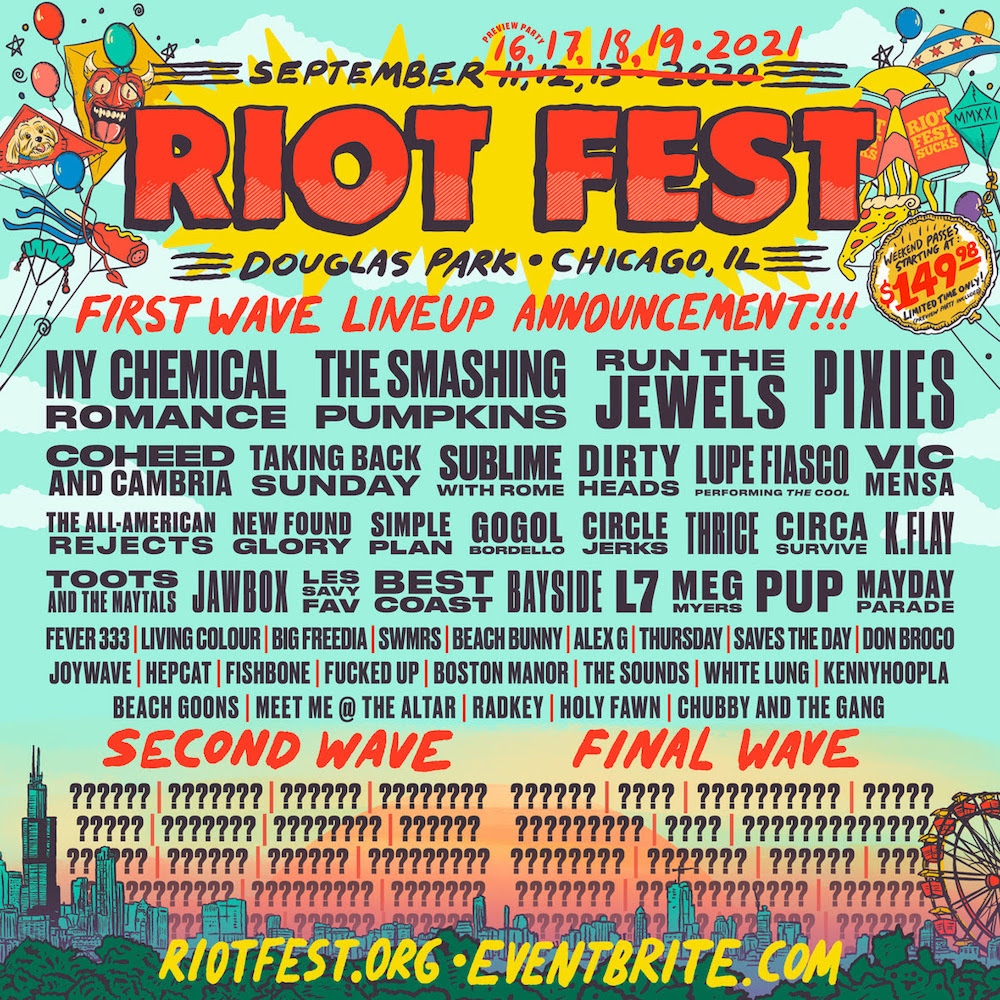 Riot Fest is skipping right over 2020 and already planning to return for 2021. The Chicago-based festival, which takes place in September every year, has announced is initial lineup for next year. It'll retain the My Chemical Romance reunion, which was announced back in January (they just revealed a new 2021 itinerary), and it'll also have performances from the Smashing Pumpkins, Run The Jewels, Pixies, Lupe Fiasco (performing The Cool in full), Vic Mensa, Les Savy Fav, Best Coast, L7, PUP, Big Freedia, Alex G, Thursday, Fucked Up, White Lung, and more.