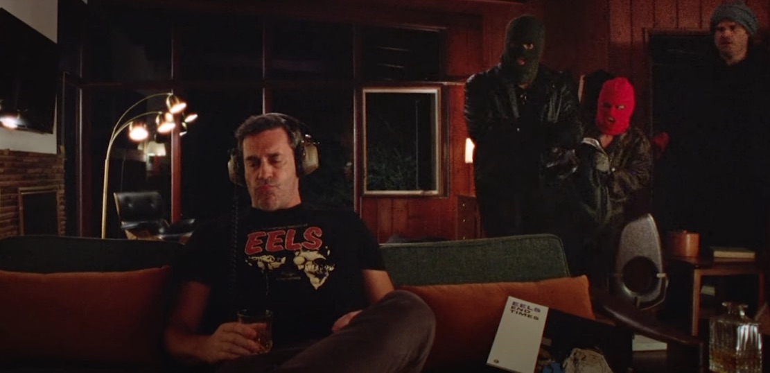 In director Greg Barnes' video, Hamm rocks an Eels shirt and lives in a house full of Eels memorabilia. He get so into listening to "Are We Alright Again" on headphones that he doesn't notice the ski-masked burglars coming into his house and taking all his stuff. Mike Mitchell is in it, too. Mitchell starred in Eels' "Today Is The Day" video a couple of years ago, and was also in the Netflix series Love with Eels frontman Mark Oliver Everett.