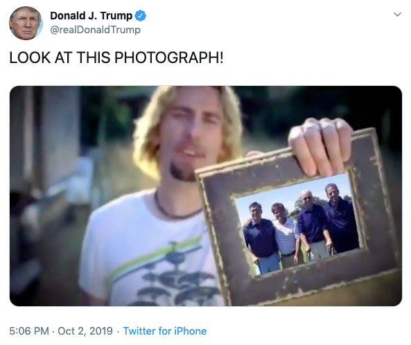 Among the many ways Nickelback have become a punchline over the years: The video for their 2005 smash "Photograph" is the source material for innumerable dank memes. Something about Chad Kroeger holding out a photograph while instructing you to "look at this photograph" tickles the internet's collective lizard brain. We have been invited to "look at this graph" and "look at this meme." Even Donald Trump took part in this pastime last fall, when he tweeted out a meme of Kroeger holding a photo of the Biden family, headlined, of course, "LOOK AT THIS PHOTOGRAPH." (The band had the image removed; the tweet now reads, "This media has been disabled in response to a report by the copyright owner.") Now, in exchange for what must have been a giant Scrooge McDuck pile of money, they've decided to play along with the joke.