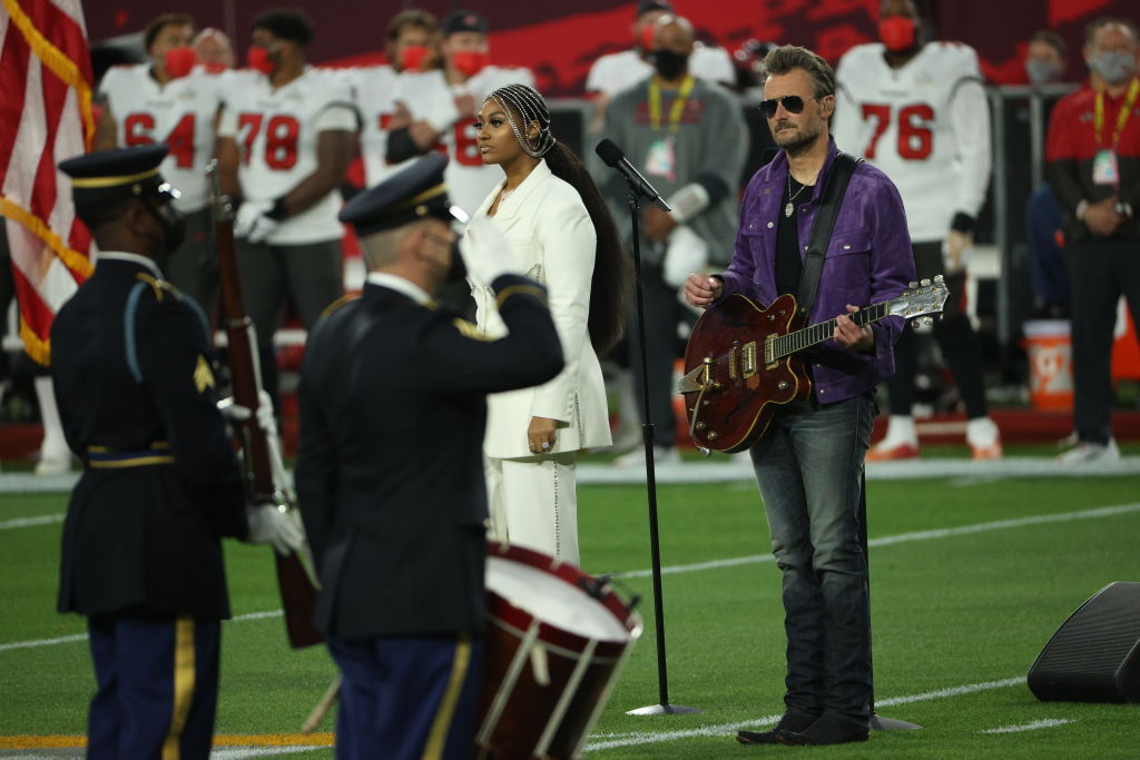 Eric Church and Jazmine Sullivan sang the national anthem to kick off Super Bowl LV, which is taking place at the Raymond James Stadium in Tampa, Florida. Country superstar Church is getting ready to release a new triple album, Heart & Soul, which will be rolled out throughout April. Sullivan put out a new project, Heaux Tales, last month, her first album in five years.