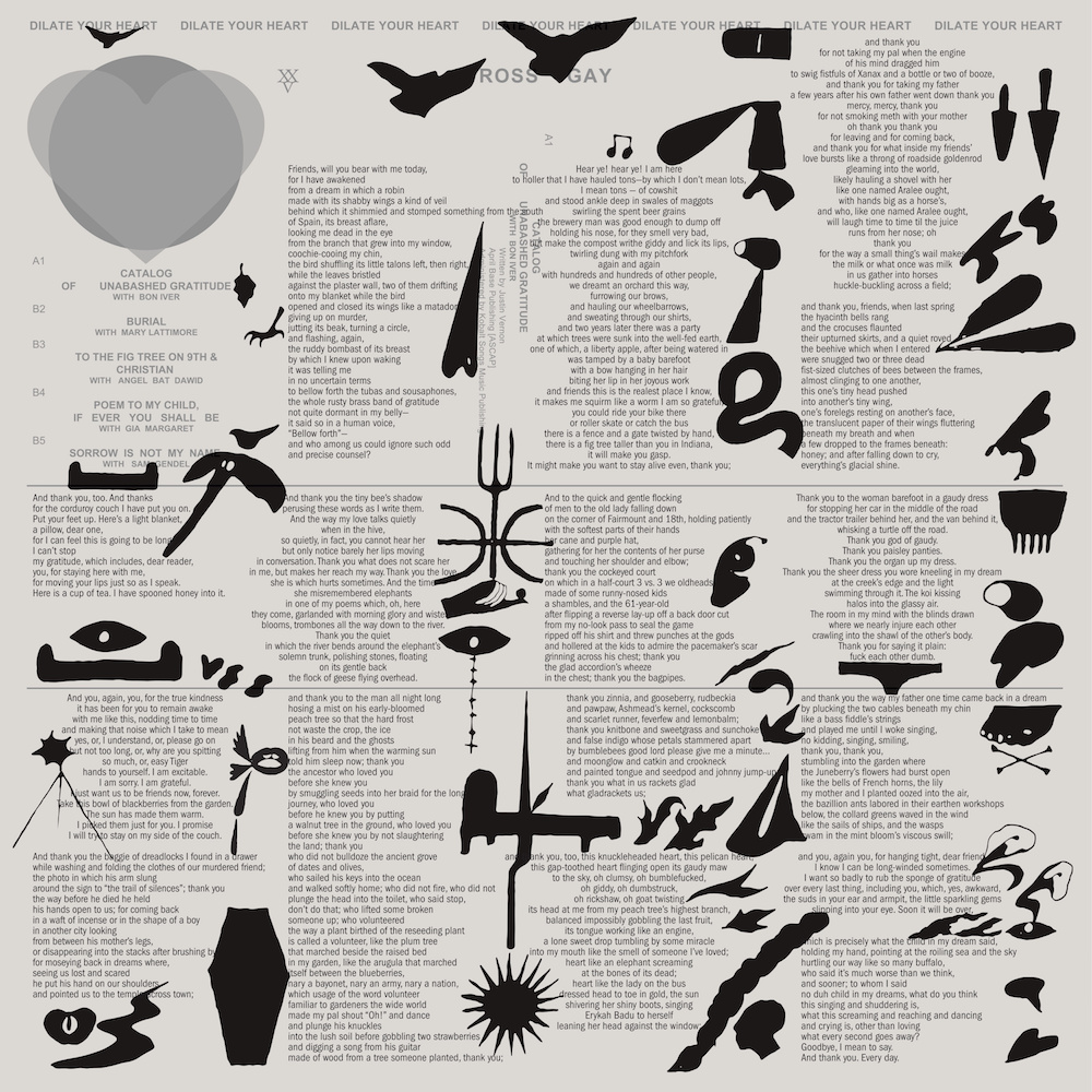 That whole campaign includes a series called Jag Quarterly, and the first installment is the first spoken-word album too come out on Jagjaguwar in 20 years. Dilate Your Heart comes from the poet Ross Gay. On the LP, Gay reads his poetry over unreleased music from artists like Mary Lattimore, Angel Bat Dawid, Gia Margaret, and Sam Gendel. The album's first single is "Catalog Of Unabashed Gratitude," a 14-minute collaboration between Bon Iver and the poet Ross Gay.