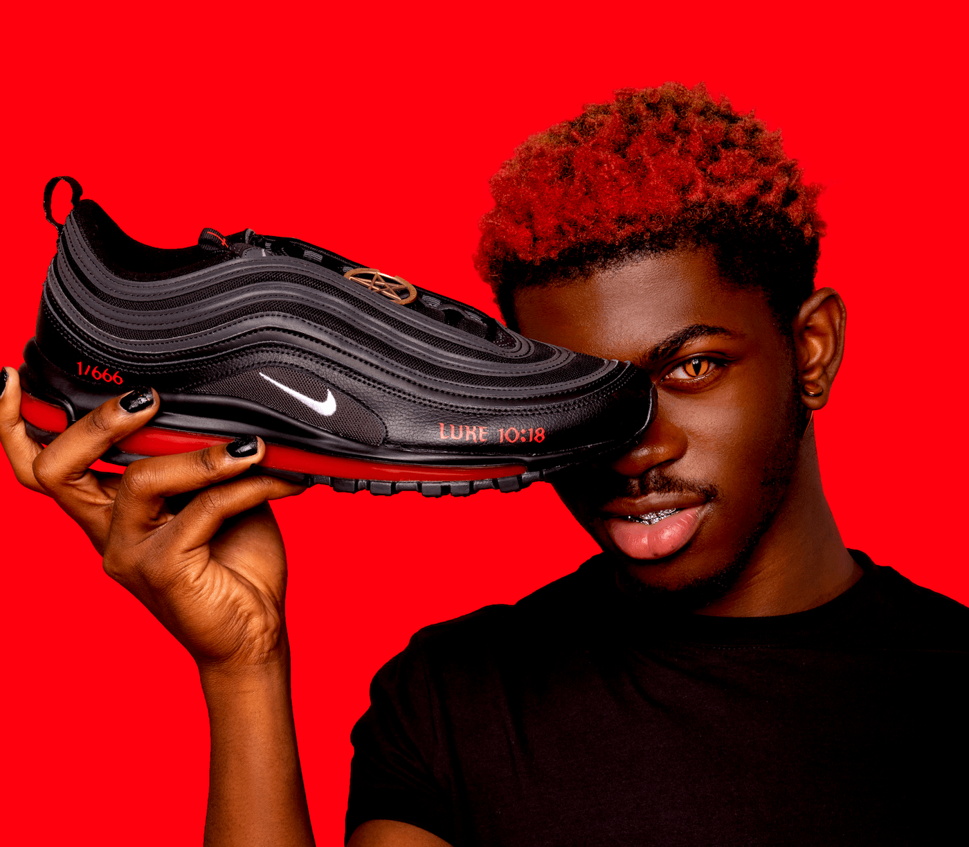 To promote the release of his new single "Montero (Call Me By Your Name)," Lil Nas X launched a streetwear collaboration with the company MSCHF dubbed the Satan Shoes. The shoes are customized Nike Air Max 97s that come in a limited-edition run of 666 (they're all sold out now) and have a pentagram charm and (purportedly) a drop of human blood mixed with ink that fills an air bubble in the shoes.