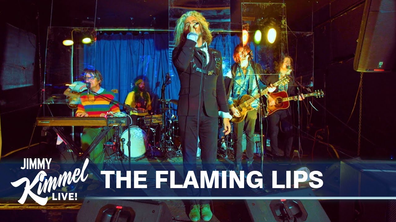 In recent months, the Flaming Lips have been playing a series of "space bubble" shows in their Oklahoma City hometown. That's a smart adaptation of a preexisting gimmick, but it's not all the Flaming Lips can do. Last night, the Lips were musical guests on Jimmy Kimmel Live, and they didn't bust out the space bubbles for that one. Instead, they returned to the site of their first-ever show, which took place at the Blue Note Lounge in Oklahoma City way back in 1983. They also brought along a friend.