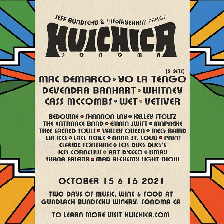 This year, Huichica goes down 10/15-16 at Gundlach Bundschu Winery in Sonoma, and it's got Mac DeMarco and Yo La Tengo as its headliners. Yo La Tengo will play two sets, which is definitely better than one Yo La Tengo set. The rest of the bill leans toward dreamy indie and to the stuff that we used to call freak-folk. The bill includes Devendra Banhard, Whitney, Cass McCombs, Wet, Vetiver, Bedouine, Shannon Ley, Kelley Stoltz, the Entrance Band, Meg Baird, and Lia Ices, among others. The poster also promises something called "Mad Alchemy Light Show," which sounds sick.