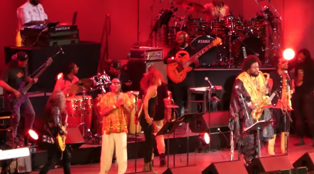 Kamasi Washington is one of the many, many artists that contributed to Metallica's massive new covers compilation called The Metallica Blacklist, which features 53 artists' takes on "Black Album" songs. Last night, Washington performed at the Hollywood Bowl in Los Angeles and brought out Metallica's own Kirk Hammett and Robert Trujillo to help him debut his cover of "My Friend Of Misery." Watch below.