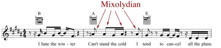 Note that Lorde deploys the A natural note (♭7) only over the A (♭VII) chord, not over B or E. This is pretty "square" and an obvious use of Mixolydian mode, but it works nonetheless. ("Royals" uses Mixolydian mode much more powerfully and creatively by invoking a sense of portending opacity over the tonic (I) chord.)