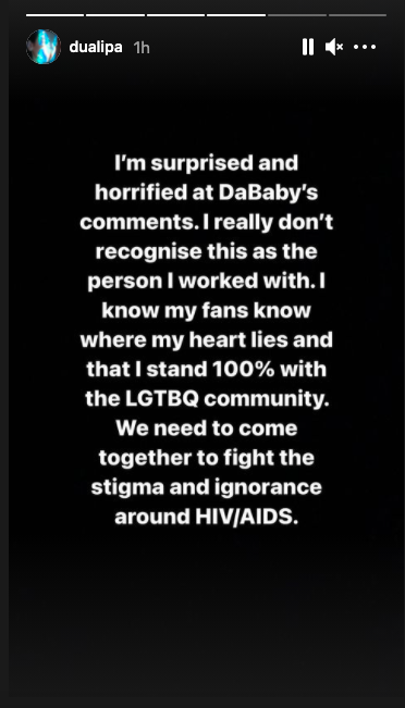 This weekend, DaBaby made homophobic comments during his set at Rolling Loud Miami and doubled down when trying to defend himself. Today, in a post on her Instagram story, Dua Lipa said that she is "surprised and horrified" by what he said. "I really don't recognise this as the person I worked with," she wrote. "I know my fans know where my heart lies and that I stand 100% with the LGTBQ [sic] community. We need to come together to fight the stigma and ignorance around HIV/AIDS."