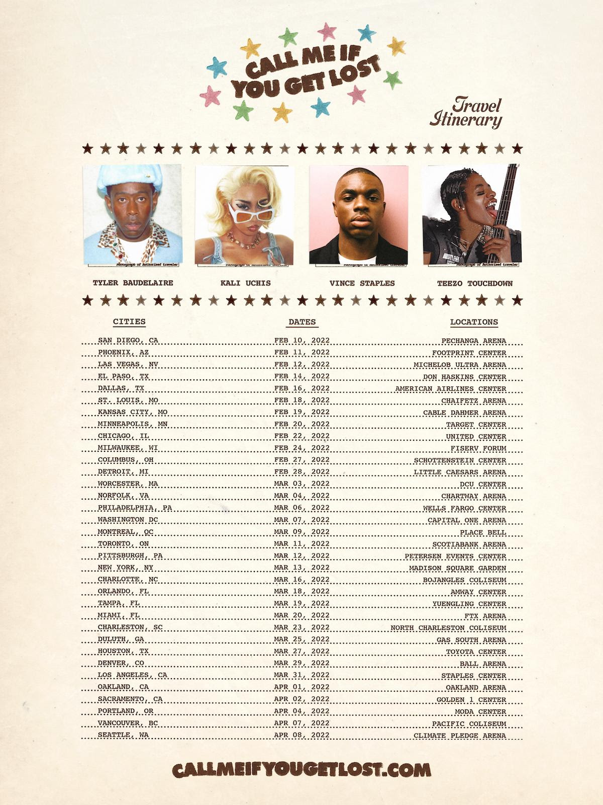 The openers for Tyler's tour are nothing to sneeze at: Kali Uchis, who put out the Spanish-language album Sin Miedo (del Amor y Otros Demonios) last year; Vince Staples, who just released a self-titled album; and the Houston-based up-and-comer Teezo Touchdown.
