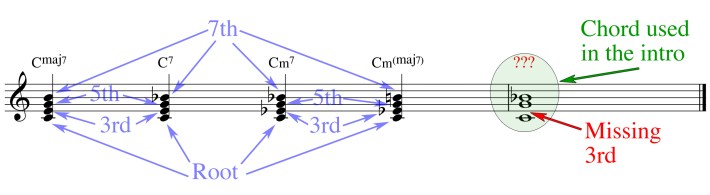 The absence of the 3rd in the intro creates a kind of suspension because we're unsure how to feel without that crucial harmonic ingredient. Is it Major or minor? Is it foreboding, or does it invoke eager anticipation? Is it a C7 chord (with its inherent feeling of instability and movement) or a Cmin7 chord (with its intrinsic stability, but tempered with a melancholic suggestion)? The ambiguity creates a kind of sensory incompleteness -- an incompleteness that engages the imagination of the listener as compensation for what the harmonic language is leaving out. It draws in the listener to complete the chord themselves, filling in the missing 3rd based on their own expectations and biases. I believe this is why the intro lasts as long as it does: It sets the stage by enticing us to invest a part of ourselves in the song even before we hear the first note of the melody.