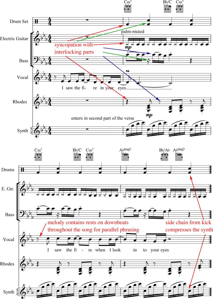 When we hear the diatonic C-minor melody at the top of the verse, it feels oddly liberating because it releases the ambiguous tension of the intro. However, that relief is soon exchanged for exhilaration when we hear the deep-pocket groove and interlocking disco syncopations that characterize the rest of the song. The 16th-note hi-hat pattern has a smooth but expressive and dynamic feel (the kind of thing Jeff Porcaro called the "lope" in his own hi-hat playing), which results from Max Martin protégé Shellback playing live drums on the track. Undoubtedly, the drum performance was chopped, quantized, and sewn back together in order to satisfy the "on-grid" demands of modern pop music -- but it still retains a live feel, even though the snare is triggering a fast-gated-reverb sample in order to thicken the texture and deliver consistency to the backbeat. This, coupled with the propulsive 16th-note rhythm guitar part (played with a dotted-8th-note delay and sweep filter), infuses a human feel juxtaposing the sequenced and programmed keyboards that fill out the highly syncopated groove.