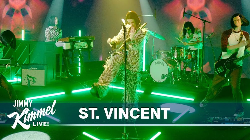 St. Vincent mastermind Annie Clark is having a busy year. First, there was the new album Daddy's Home. Then, there was The Nowhere Inn, the sort of Lynchian mockumentary that she made with Carrie Brownstein, as well as that movie's soundtrack. Lately, St. Vincent has also returned to the road, playing high up on the bill at a lot of festivals. And last night, St. Vincent were the musical guests on Jimmy Kimmel Live, where they performed "The Nowhere Inn," the title track from the new film.