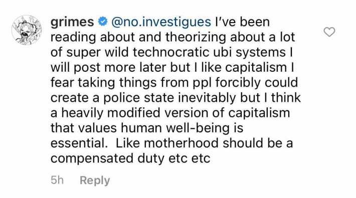 In some additional comments, she clarified: "I've been reading about and theorizing about a lot of super wild technocratic ubi systems I will post more later but I like capitalism I fear taking things from ppl forcibly could create a police state inevitably but I think a heavily modified version of capitalism that values human well-being is essential. Like motherhood should be a compensated duty etc etc."