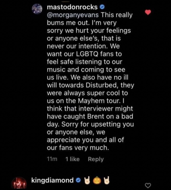This really bums me out. I'm very sorry we hurt your feelings or anyone else's, that is never our intention. We want our LGBTQ fans to feel safe listening to our music and coming to see us live. We also have no ill will towards Disturbed, they were always super cool to us on the Mayhem tour. I think that interviewer might have caught Brent on a bad day. Sorry for upsetting you or anyone else, we appreciate you and all of our fans very much.