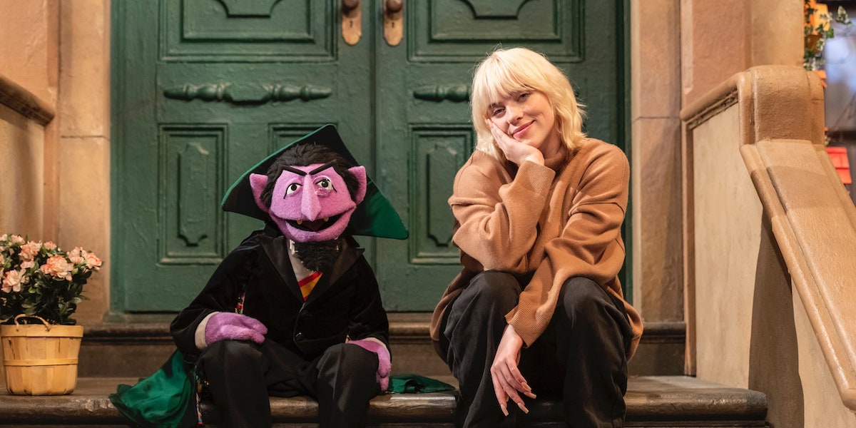 Billie Eilish is one of the guests featured on Sesame Street, which begins its 52nd season this week on HBO Max. (This season's musical guests will also include Kacey Musgraves and Anderson .Paak.) Though Eilish's full episode of the show won't air until next June, a clip from the episode has been released that shows Eilish singing the title track of her new album Happier Than Ever with the Count. Because this is Sesame Street and Eilish is sitting next to the Count, naturally "Happier Than Ever" has some updated lyrics that are all about counting (though not beyond 2). Cute! Watch below.