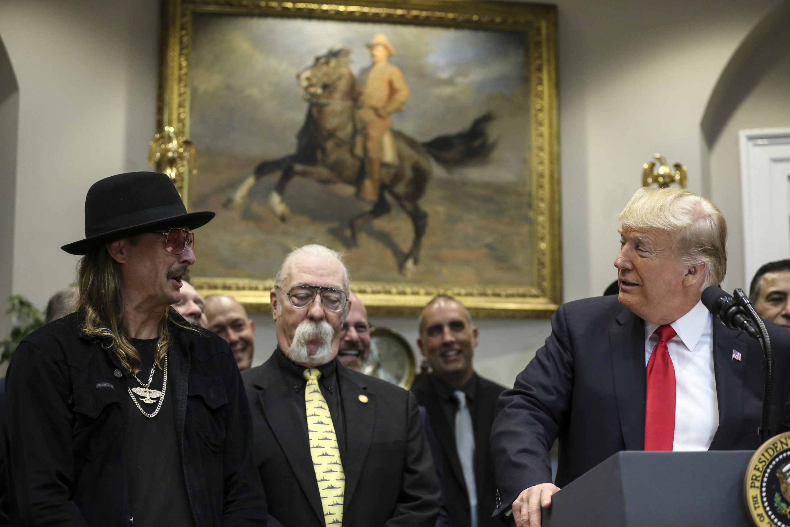Back in 2017, former vice presidential candidate turned professional celebrity Sarah Palin brought right-wing Michigan rockers Ted Nugent and Kid Rock along for a powwow with President Donald Trump at the Oval Office. At the time, Nugent said the group discussed "health, fitness, food, rock 'n' roll, Chuck Berry and Bo Diddley, secure borders, the history of the United States, guns, bullets, bows and arrows, North Korea, Russia, and a half-dozen other issues." Rock maintained an ongoing relationship with Trump, and in a new interview with the polarizing Fox News pundit Tucker Carlson, he elaborates on the more sensitive subjects he discussed with Trump during his presidency.