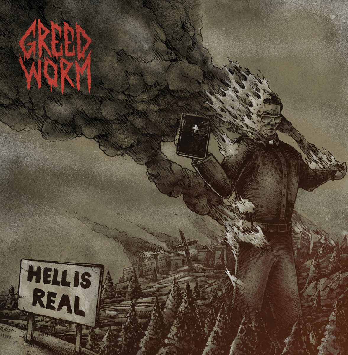 Featuring members of Crowning, Itto, Ikaray, Snuffed, Shrivel Up, and Cloud Cruiser, Chicago's Greed Worm play a harsh, brutal, violently burly form of music they call "NU-DEATH SLUDGE." This is insanely heavy and volatile stuff, and on their new Hell Is Real EP they've laced it with samples implicitly critiquing such American cultural pillars as capitalism, patriotism, and religion. Opener "Trash Kingdom" begins with crushing, writhing slo-mo ugliness then segues to breathtaking uptempo destruction halfway through. The rest of the project mostly proceeds in kind -- though there's nothing kind about it -- with some unexpected detours like the atmospheric intro on "Cold Dead Hands." Fall headfirst into hell below: