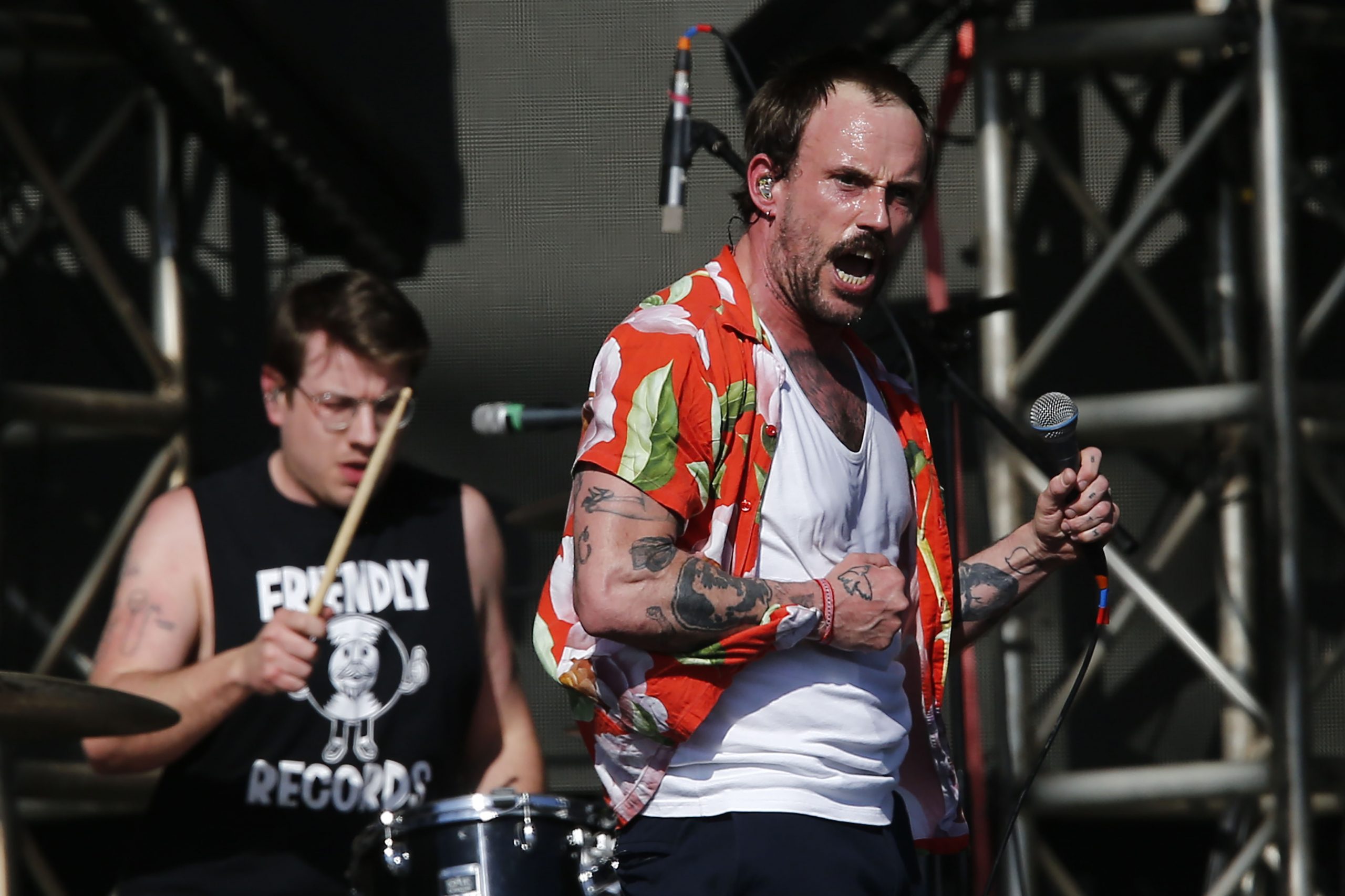 SANTIAGO, CHILE – MARCH 18: Jon Beavis and Joe Talbot of Idles perform during day one of Lollapalooza Chile 2022 at Parque Bicentenario Cerrillos on March 18, 2022 in Santiago, Chile. (Photo by Marcelo Hernandez/Getty Images)