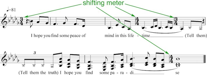 Like much of the music on the album, the song doesn't immediately conform to a familiar song structure (like the verse-chorus form or the 32-bar song form). But it's not through-composed either. We can think of the song as a suite in three parts, each of which sounds like it could form a standalone song, and each of which defies any kind of conventional labeling.