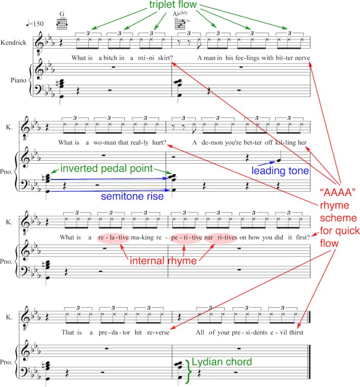 In his paper "Representing African Music," CUNY professor Kofi Agawu cautions that Western notation cannot adequately represent African or Afrodiasporic music. For now, it's the best tool I have, so I've decided to use it here while recognizing its limitations. When notating Kendrick's rap vocals, I used the concept of "pitch zones," which approximate where I hear his voice, so you should not assume these are exact notes. In other words, consider it a general representation of Kendrick's performance, not precise documentation of it.
