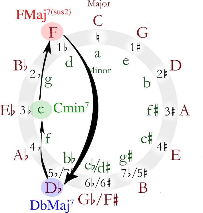 Underpinning this section is an unusual, non-diatonic chord progression (i.e., one where the chords don't all live together in the same key center). As shown in Figure 4, we have D♭Maj7 to Cmin7 to FMaj7(sus2) (or C/F). See Figure 5, below. These chord changes create a calming effect -- a peculiar juxtaposition to the feverish pace in the rhythm. The D♭Maj7 and Cmin7 chords could be the IV and iii chords in the key of A♭, with the FMaj7(sus2) serving as a kind of "borrowed" chord from a different key—likely, C Major. And when we return back to the D♭Maj7 chord, we experience the sensation of hearing a Neapolitan chord modulation in the key of C. When the "I grieve different" choruses (interludes?) land, these chords create an emotional lift -- one that feels comforting and hopeful, but also tinged with melancholy. It's a curious combination.