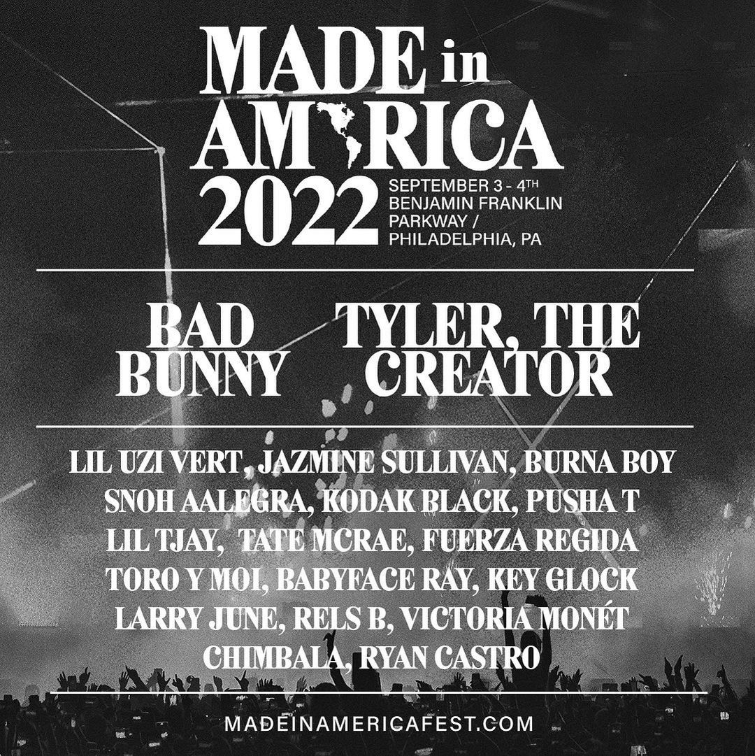 Made In America, the Roc Nation-backed festival that goes down in Philadelphia every year, has announced its lineup for 2022. Bad Bunny and Tyler, The Creator will serve as headliners over the event's two nights. Others on the roster include Lil Uzi Vert, Jazmine Sullivan, Burna Boy, Snoh Aalegra, Kodak Black, Pusha T, Lil Tjay, Tate Mcrae, Fuerza Regida, Toro y Moi, Babyface Ray, and more. It'll take place over Labor Day Weekend on September 3 and 4 on the Benjamin Franklin Parkway. Tickets are on sale now -- details here.