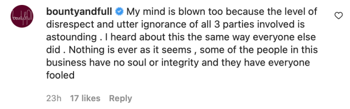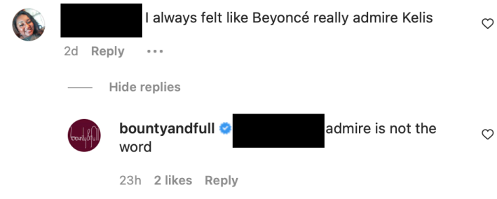 Commenting on an Instagram post through the verified account for Kelis' product line Bounty And Full, the musician had some strong words about the sample. "It's not a collab it's theft," she wrote in one. "My mind is blown too because the level of disrespect and utter ignorance of all 3 parties involved is astounding," she wrote in another. "I heard about this the same way everyone else did . Nothing is ever as it seems , some of the people in this business have no soul or integrity and they have everyone fooled."