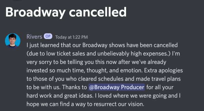 I just learned that our Broadway shows have been cancelled (due to low ticket sales and unbelievably high expenses.) I'm very sorry to be telling you this now after we've already invested so much time, thought, and emotion. Extra apologies to those of you who cleared your schedules and made travel plans to be with us. Thanks to @Broadway Producer for all your hard work and great ideas. I loved where we were going and I hope we can find a way to resurrect our vision.